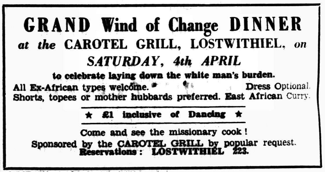 The Reids made the hotel and its restaurant a major venue for local people and organisations, directly competing with the Royal Talbot. Staunchly Conservative, the Reid’s held festive events that would now be regarded as in very poor taste. In 1964, they held a ‘Grand Wind of Change Dinner’, echoing Prime Minister Harold Macmillan’s speech about the decolonisation of Africa. The dinner was to celebrate ‘laying down the white man’s burden’, and the Reid’s requested that diners come in colonial garb. In 1968, they marked the fourth year of Labour Government with a social night in support of their spurious ‘Campaign for the Protection of Harassed Housewives and Overtaxed Breadwinners’.