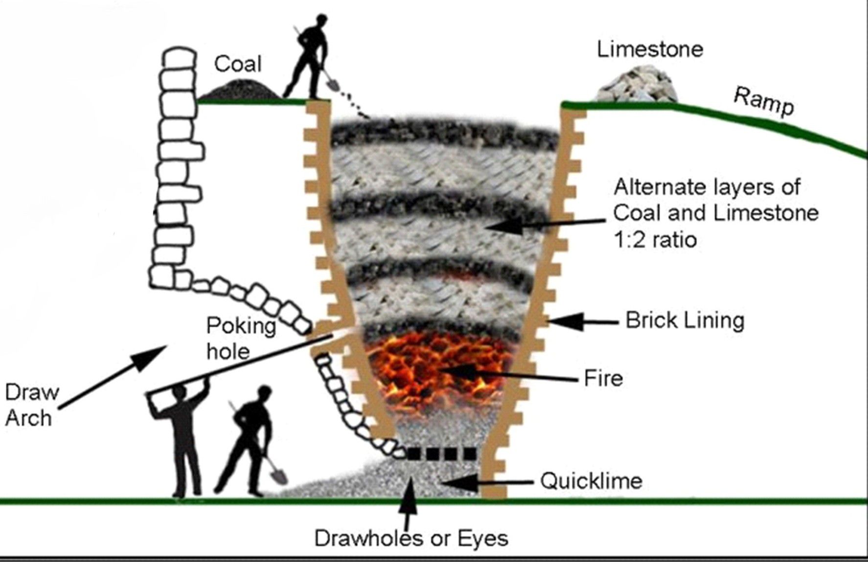 Much of the lime produced locally was used as an additive to improve the fertility of the fields. Lime was mixed with water to produce slaked lime for use in mortar for building work. This had become a major use by the 19th century. Lime kilns were dangerous places, not only were they hot (over 900°C) but they gave off copious quantities of carbon dioxide that could suffocate. Quick lime itself was a volatile product capable of producing a great heat if it came into contact with water. Kilns therefore needed to be situated away from areas of occupation.