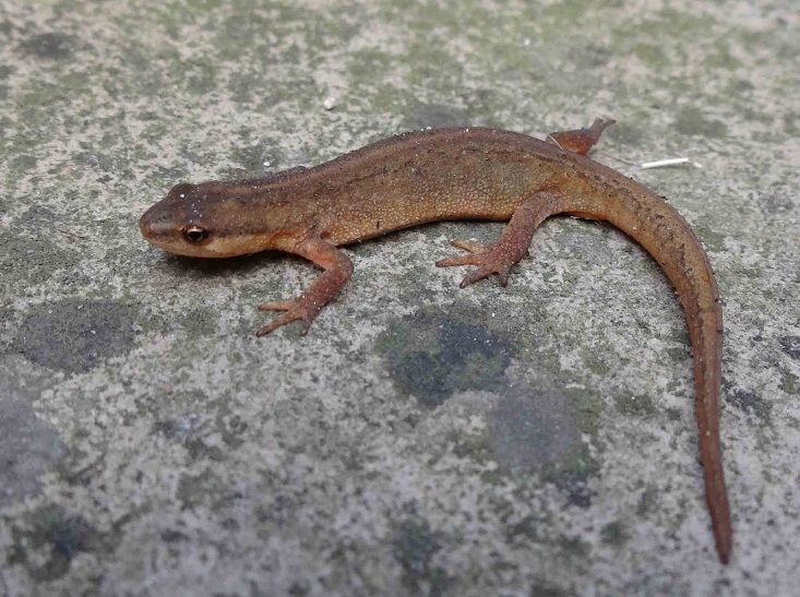 The pipistrelle glides high in the sky. This next animal is quite different, as it swims in the water and crawls along close to the ground. It is only about 10cm long, so be careful where you walk.
