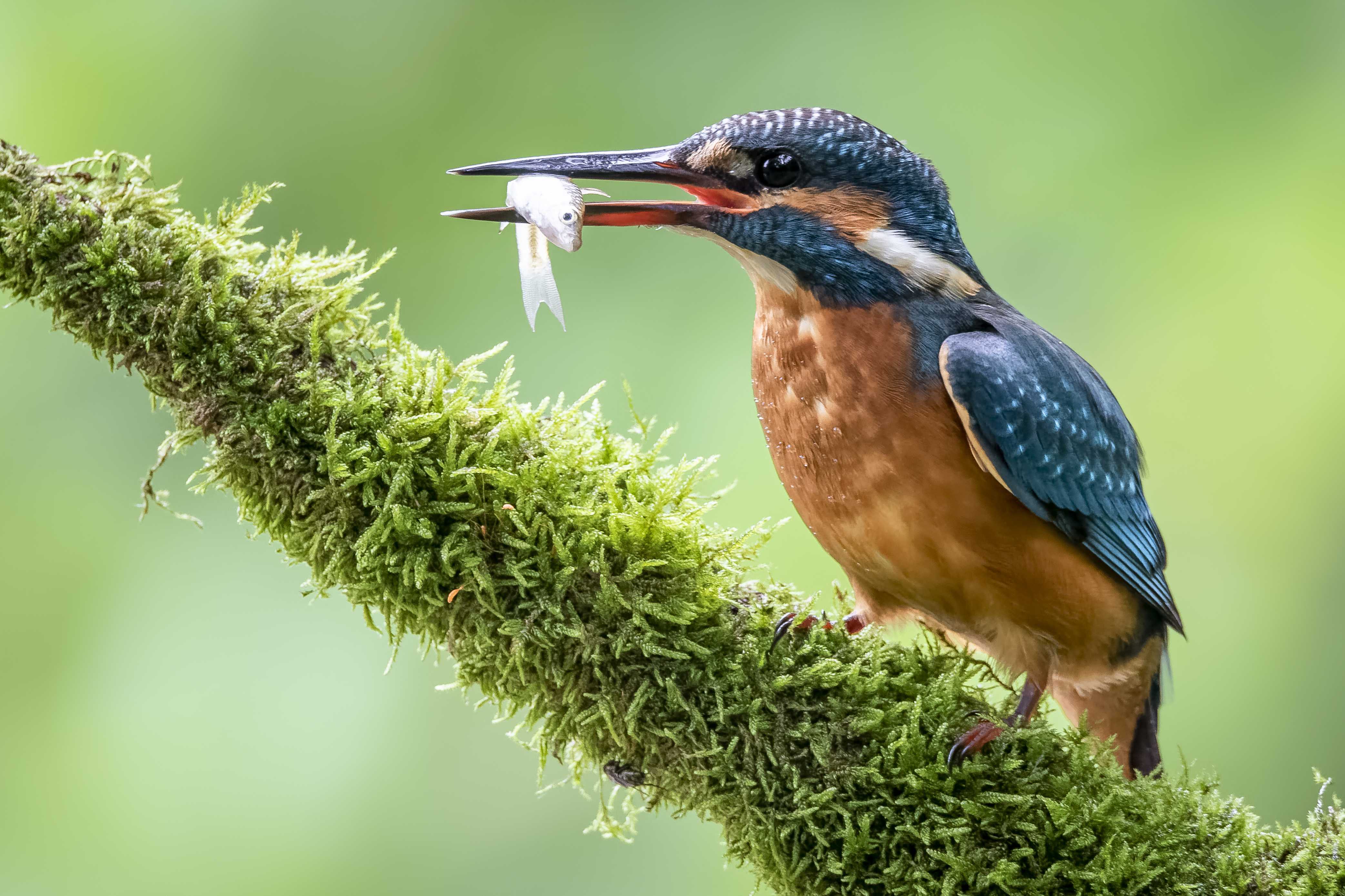 Kingfishers are very colourful birds, marked in shades of bright blue and orange. They are, however, very fast moving and are easy to miss unless you watch very carefully. They hunt from perches over the water on the riverbank, bill pointing down as they search for fish. When they see a fish, they plunge down to seize their prey. Once they have flown back to their perch, they whack the fish against it and swallow it head-first. Fish bones are indigestible and are regurgitated in pellets a few times each day. Kingfishers will also catch and eat tadpoles, insects, and aquatic insects.