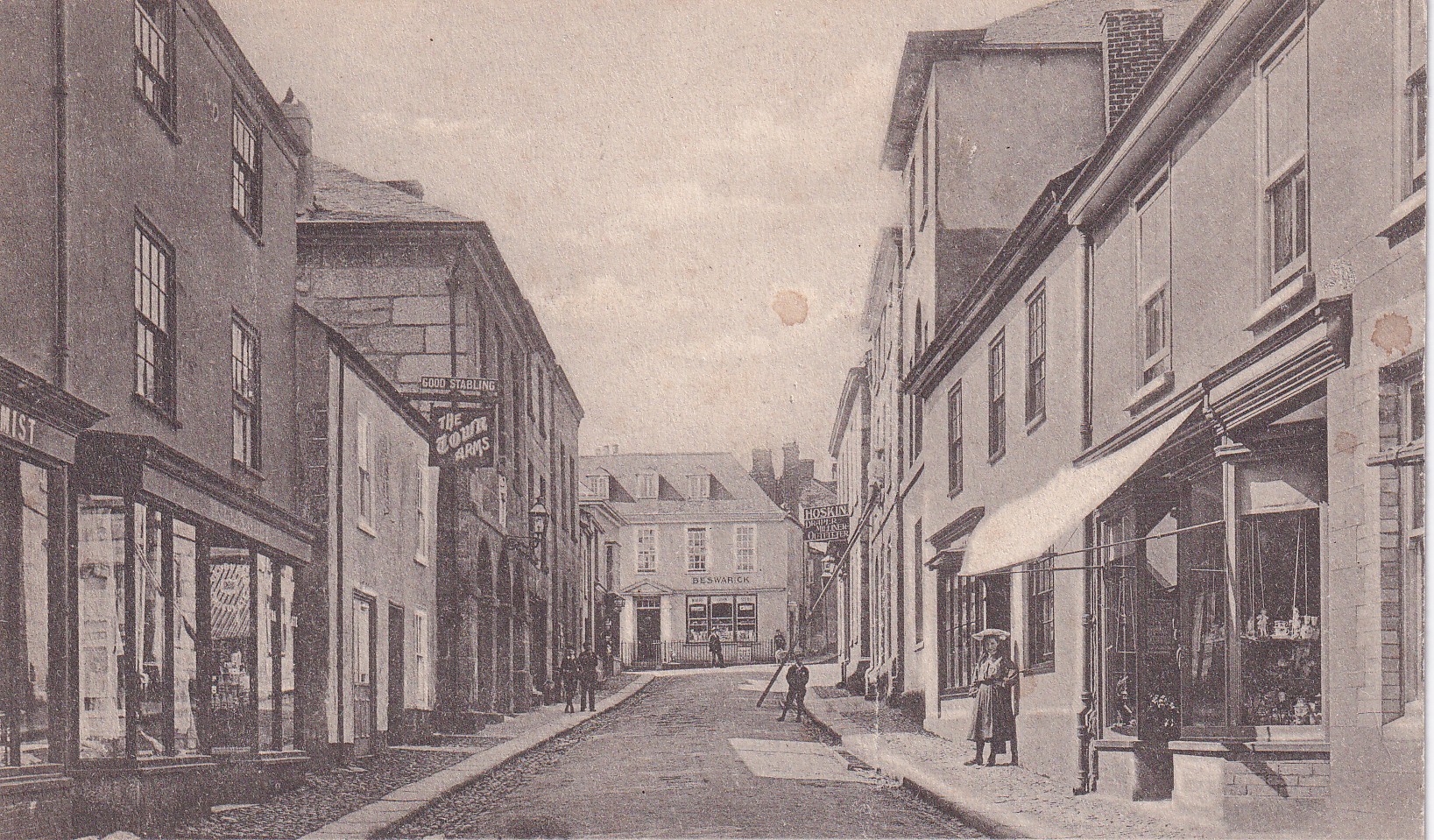 Just over 100 yards along Fore Street, at No. 15, is Ann’s Gallery, formerly the Town Arms. The building is a 17th century house that had become a pub by the late 18th century. It appears in George Bell Lawrance’s 1825 painting of Fore Street. It is recorded in 1830 as owned by William Hick and then, through the 1840s and 1850s, by Jospeh Stevens of St Veep. By 1861 it was in the hands of butcher Mathew Doney, who lived in Tangier (now Castle Hill). The pub continued to be run together with the butcher’s shop, with adjoining slaughterhouse, through the 1870s and early 1880s under Francis Bryant Cory. In 1899, its frontage and that of the now-closed Ivy Leaf Tearoom were altered to widen the pavement. The final owner was William Bate, who ran the pub from 1893 until its closure in 1904. The Town Arms Stables, now in residential use, can be seen in South Street.
